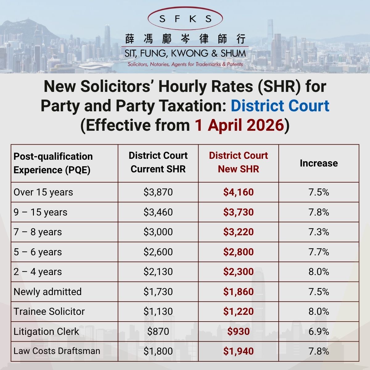 香港律師會剛公佈,終審法院首席法官已批准新一套適用於訴訟雙方之間訟費評定的律師每小時費率(「律師每小時費率」)。新費率將於2026年4月1日起生效,適用於該日期或之後所進行的一切訴訟工作。這是自現行費率於2018年1月1日實施以來的首次調整。至於2026年4月1日之前進行的法律工作,則繼續採用現行費率。